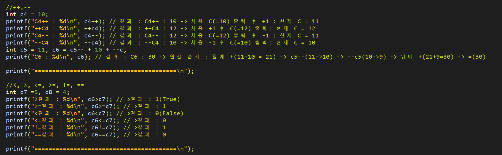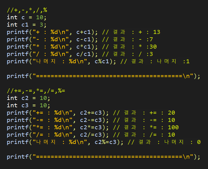 - 산술(+,-,*,/,%), 대입(=,+=,-=,*=,/=,%=), 증감(++,--), 비교(<,>,==,!=,>=,<=), 논리(&&,||,!), 비트(&,|,^,~,<<,>>), 기타(3항 연산자, pointer(&(주소),*(참조)), sizeof 등)