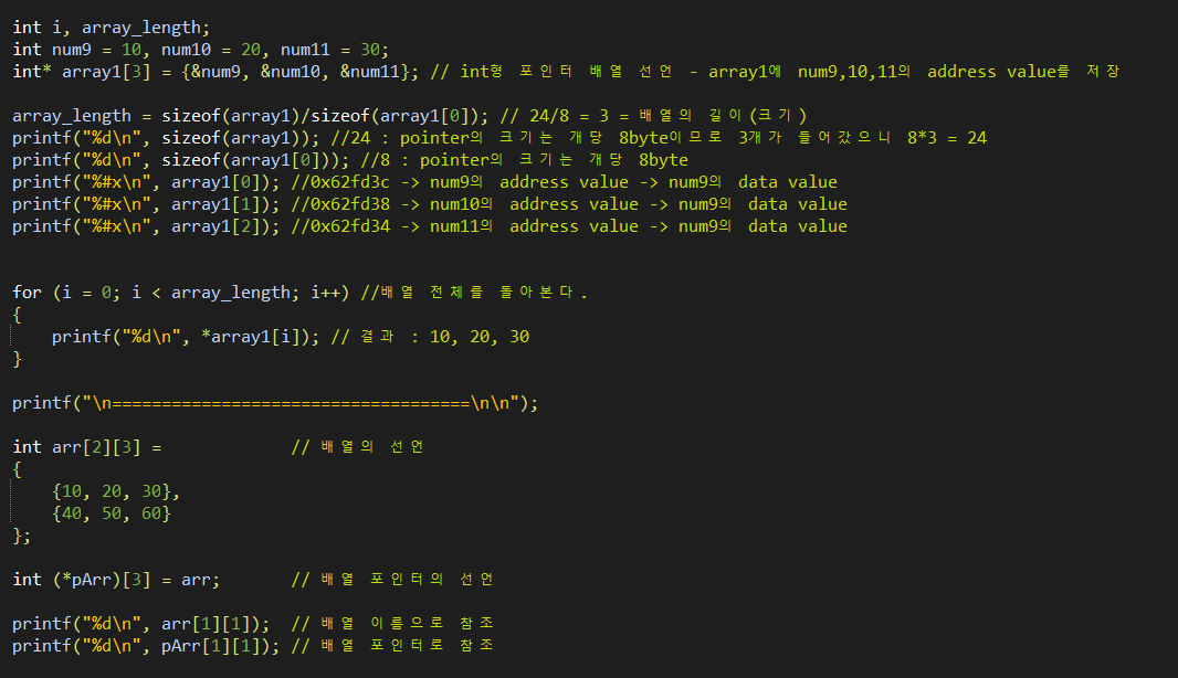 - C언어에서는 배열의 이름을 포인터처럼 사용할 수 있을 뿐만 아니라, 포인터를 배열의 이름처럼 사용