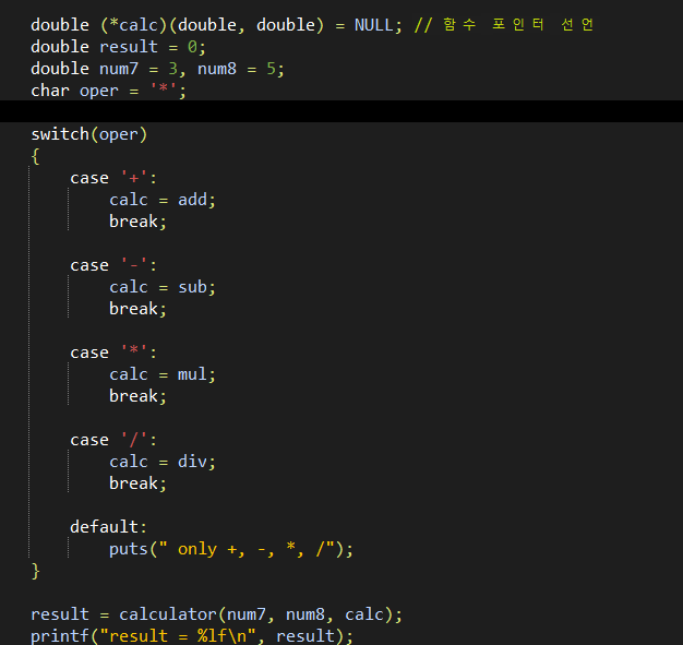 **함수 포인터 사용시 연산자의 우선순위 때문에 반드시 *ptr_func 부분을 괄호(())로 둘러싸기