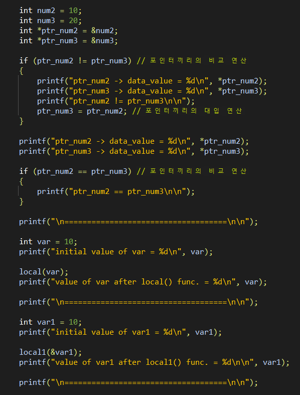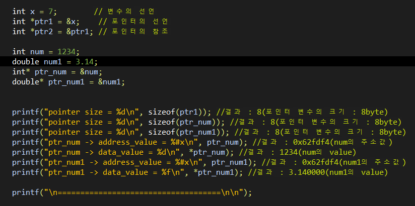 - 참조 연산자(*) : 포인터의 이름이나 주소 앞에 사용 / 포인터에 가리키는 주소에 저장된 값을 반환