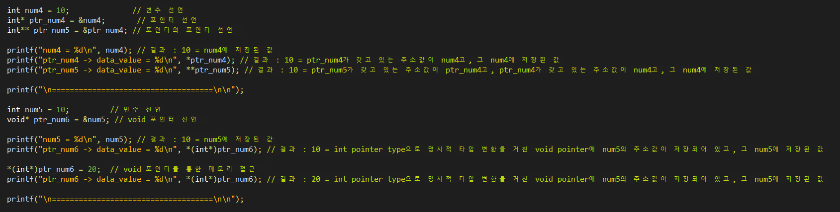 void pointer : 대상이 되는 데이터의 타입을 명시하지 않은 포인터 / 변수, 함수, 포인터 등 어떠한 값도 가리킬 수 있지만, 포인터 연산이나 메모리 참조와 같은 작업은 할 수 없습니다 = 주소값을 저장하는 것 이외에는 아무것도 할 수 없는 포인터 / 사용할 때마다 명시적 타입 변환을 하고 난 뒤에 사용