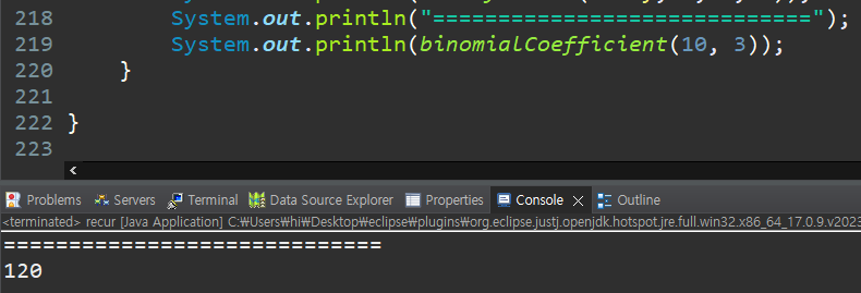 - 이항계수(binomial theorem) 알고리즘 : 조합론에서 사용되며, n개의 서로 다른 원소에서 r개의 원소를 선택하는 경우의 수를 계산