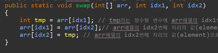 = 1개의 배열에 2개의 index를 이용해 원소를 교환할 것이므로, 배열 1개와 index 2개를 매개변수로 선언
