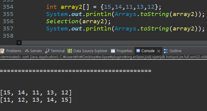 : array에서 index를 하나 선택하고 값이 가장 작은 index 찾기 / 앞서 i를 통해, index 중 가장 작은 값을 가진 것을 저장했으므로, j는 i+1 즉, 하나를 뺀 나머지 elements 중에서 가장 작은 값을 가진 index를 찾는다.